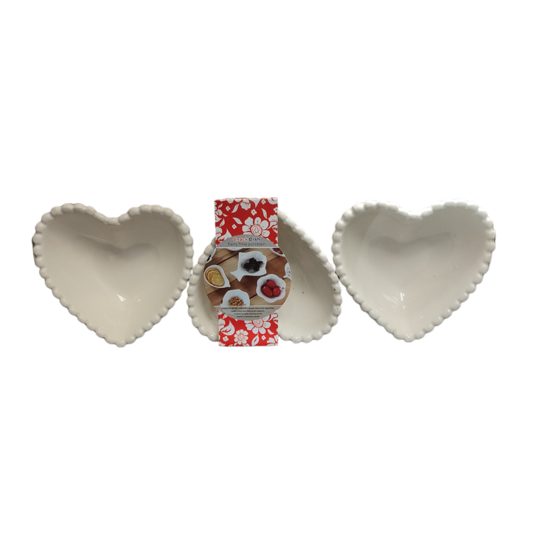 Σετ 3 τεμαχίων μπολάκια σε σχήμα καρδιά. Ιδανικά για ορεκτικά, γλύκα ή ξηρούς καρπούς. Κατασκευασμένα από πορσελάνη. Εύκολο πλύσιμο. Διαστάσεις 10x10x4cm.
