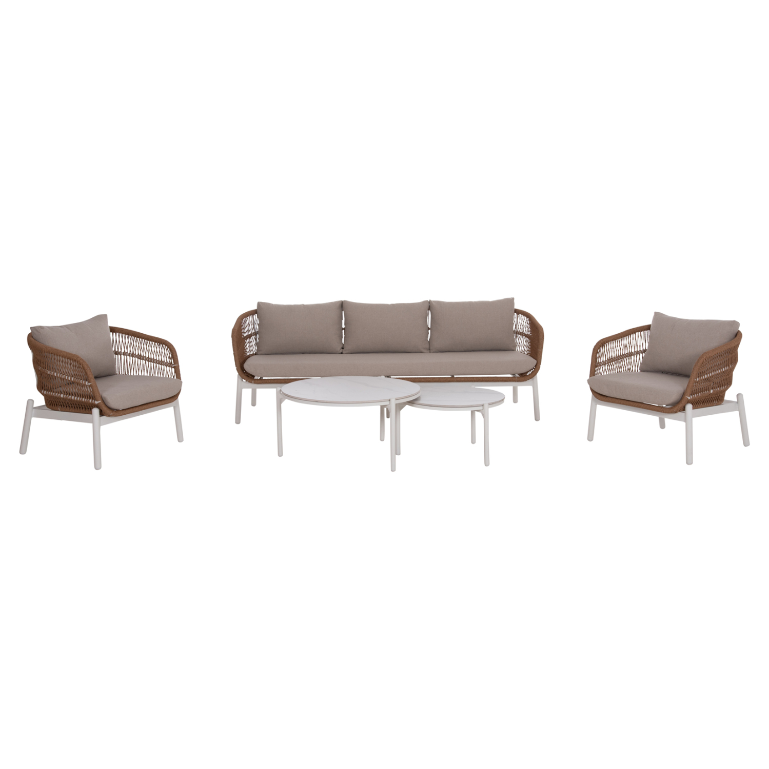 Το σετ περιλαμβάνει έναν 3θέσιο καναπέ, δύο πολυθρόνες ίδιας σχεδίασης και δύο στρογγυλά τραπεζάκια με κεραμικές επιφάνειες, δημιουργώντας έναν καλαίσθητο και λειτουργικό χώρο εξωτερικής καθιστικής απόλαυσης.