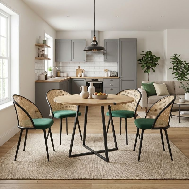 Η τραπεζαρία Rubes – Jacob συνδυάζει την πλούσια υφή του βελούδου της καρέκλας με τη στιβαρότητα του μεταλλικού σκελετού, δημιουργώντας μια ιδανική ισορροπία ανάμεσα στην αισθητική και τη λειτουργικότητα. Η εντυπωσιακή πλάτη από PE rattan προσδίδει κομψότητα και χαρακτήρα στον χώρο. Αποτελεί ιδανική επιλογή τόσο για τη τραπεζαρία ενός μοντέρνου σπιτιού όσο και για επαγγελματικούς χώρους, όπως καφέ, εστιατόρια ή Airbnb, όπου η λεπτομέρεια και το design κάνουν τη διαφορά.
