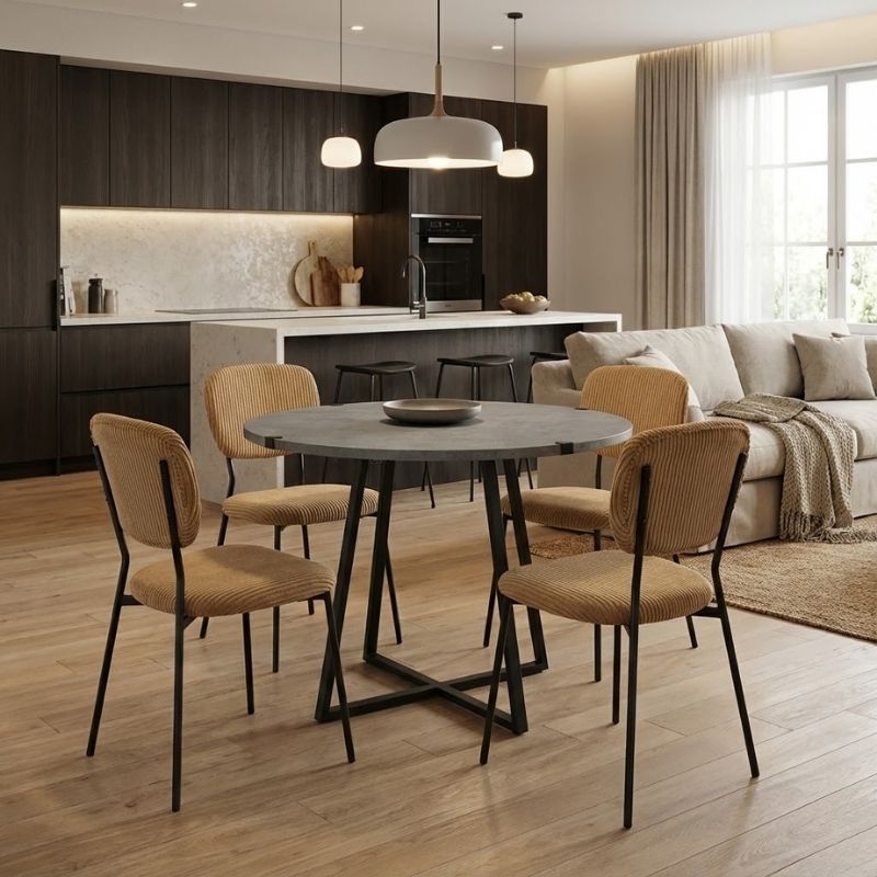 Η τραπεζαρία Rubes – Kevin θα φέρει μία αίσθηση εκλεπτυσμένης κομψότητας στον χώρο σας. Το πλούσιο κοτλέ ύφασμα της καρέκλας χαρίζει ζεστασιά και υφή, ενώ τα μεταλλικά πόδια προσδίδουν μοντέρνο χαρακτήρα και σταθερότητα. Ιδανική επιλογή τόσο για το σπίτι όσο και για επαγγελματικούς χώρους που θέλουν να επικοινωνήσουν ποιότητα και design σε κάθε λεπτομέρεια.