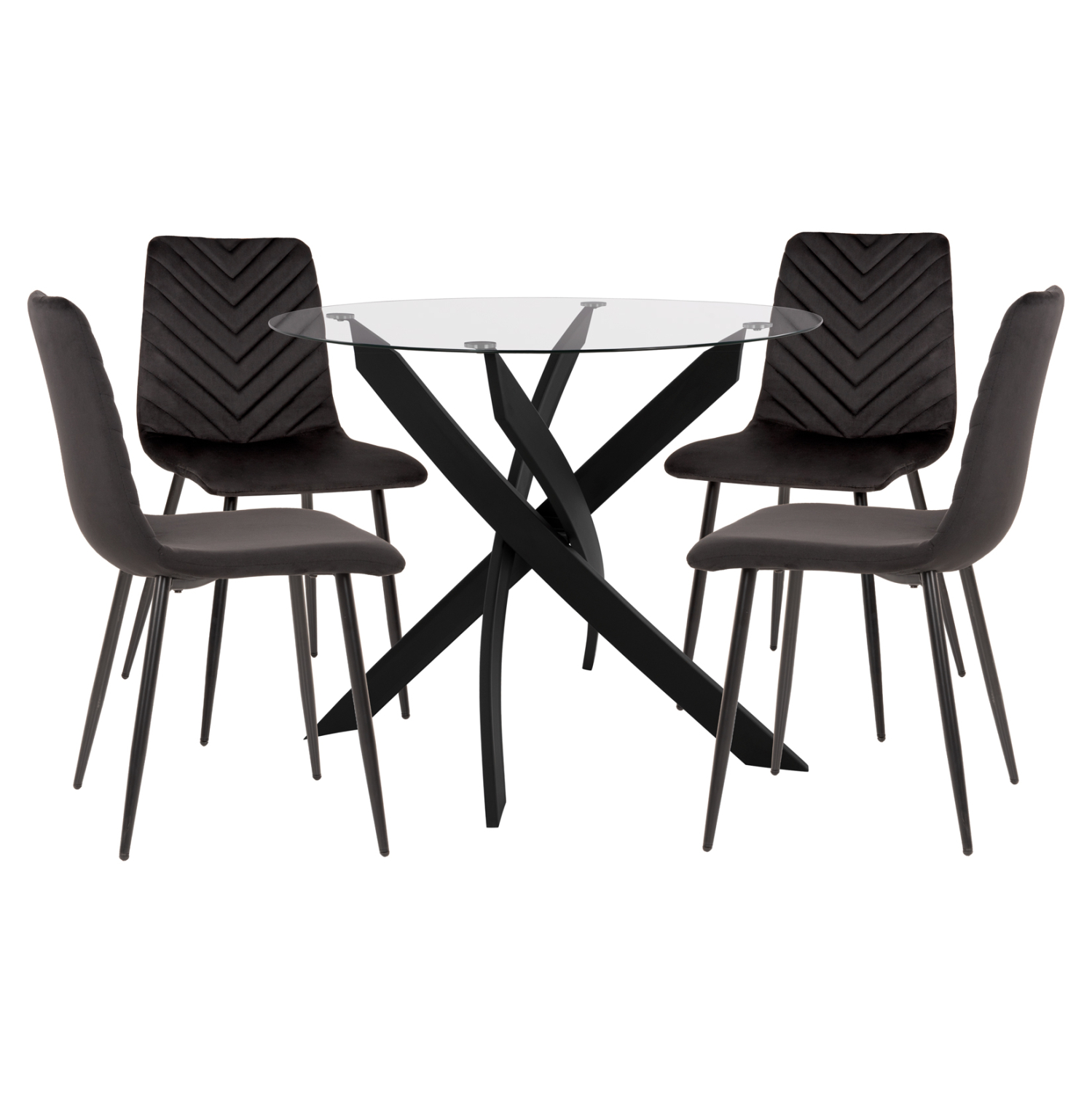 Το σετ τραπεζαρίας εσωτερικού χώρου JAFARU αποτελείται από 4 καρέκλες επενδυμένες με βελούδο με μεσαίου ύψους πλάτη και μεταλλικά πόδια, και ένα μοντέρνο στρογγυλό τραπέζι με γυάλινη επιφάνεια. Όλο το σύνολο είναι σε ΜΑΥΡΟ χρώμα. Ένα όμορφο και πρακτικό σύνολο που θα αλλάξει την εικόνα της τραπεζαρίας σας.