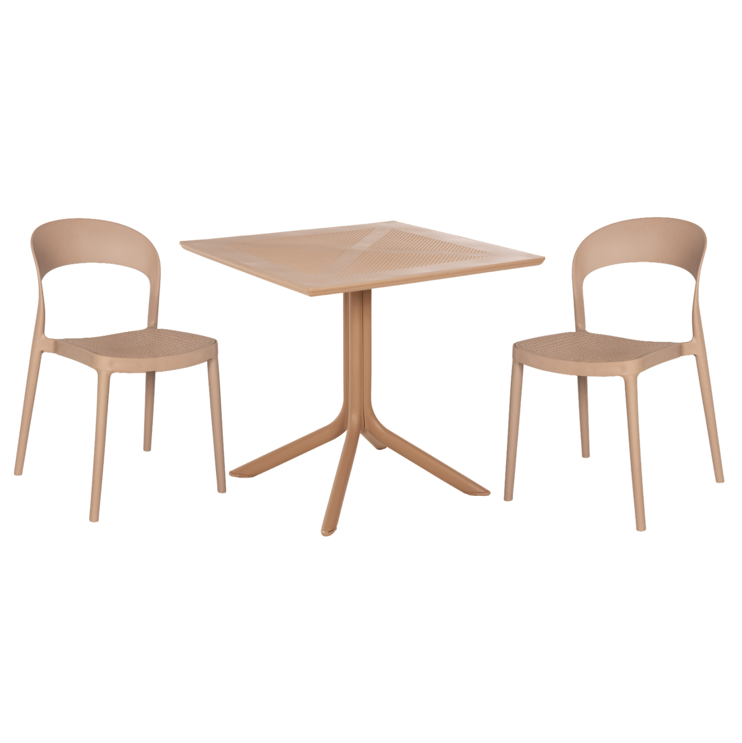Αυτό είναι ένα σετ τραπεζαρίας εξωτερικού χώρου που απευθύνεται τόσο σε ιδιώτες όσο και σε επαγγελματίες και ενδείκνυται για περιορισμένους χώρους. Αποτελείται από 1 τετράγωνο τραπέζι πολυπροπυλενίου με «διάτρητη» επιφάνεια σε χρώμα ΚΑΠΟΥΤΣΙΝΟ, και 2 όμορφες καρέκλες πολυπροπυλενίου με «διάτρητο» κάθισμα σε ίδιο χρώμα.