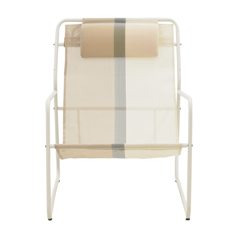 * Επένδυση υφάσματος textinene γκρι-εκρού χρώματος. Το textilene είναι ύφασμα μεγάλης αντοχής στην ηλιακή ακτινοβολία UV και την υγρασία, ενώ παράλληλα αφήνει το δέρμα να “αναπνέει” δημιουργώντας έτσι άνεση στην έδραση.