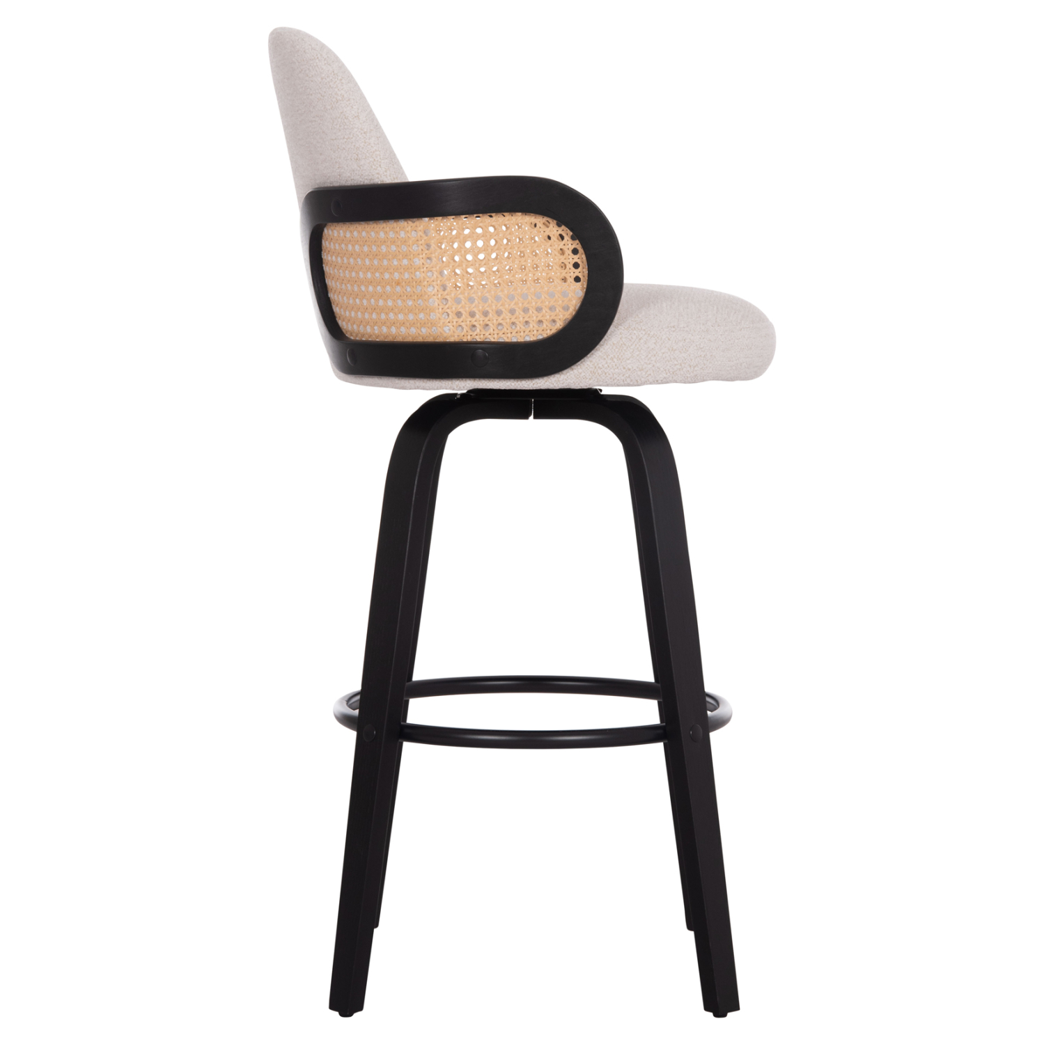 Το περιστρεφόμενο σκαμπό μπαρ BECKER αποτελεί ακόμα μια εξαιρετική πρόταση, κυρίως για επαγγελματικούς χώρους. Ο πανέμορφος σκελετός με το συμμετρικό design είναι από plywood σε επιβλητικό ΜΑΥΡΟ χρώμα, και το χαρακτηριστικό του είναι η μπεζ «σίτα» που υπάρχει στην κατασκευή των μπράτσων. Το κάθισμα και η πλάτη είναι επενδυμένα με υπέροχο ανάγλυφο ύφασμα σε ΕΚΡΟΥ χρώμα, ενώ στο κάτω μέρος των ποδιών υπάρχουν ρεγουλατόροι για ρύθμιση της σταθερότητας του σκαμπό. Διαθέτει και υποπόδιο που ενώνει τα 4 πόδια κυκλικά.