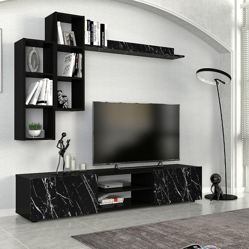 Σύνθεση τηλεόρασης Duana Megapap χρώμα μαύρο εφέ μαρμάρου – μαύρο 180x38x35,7εκ.