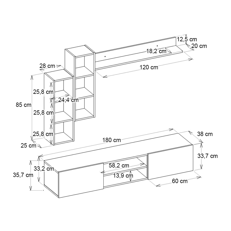• Η σύνθεση διαθέτει τρεις επιτοίχιες ραφιέρες, οι οποίες μπορούν να τοποθετηθούν όπως επιθυμείτε.