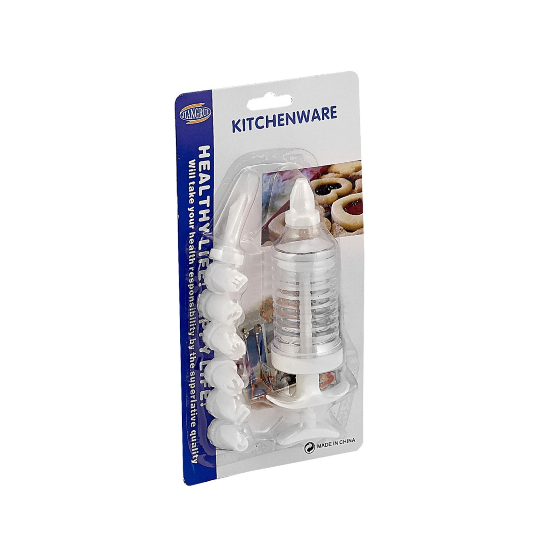 Κορνέ ζαχαροπλαστικής σε σχήμα σύριγγας. Διαθέτει έμβολο και 8 ακροφύσια, σε διάφορα σχέδια. Ιδανικό για την κουζίνα σας. Είναι κατάλληλο για να γαρνίρετε και να διακοσμήσετε το γλυκό και το φαγητό με παχύρρευστα υλικά.