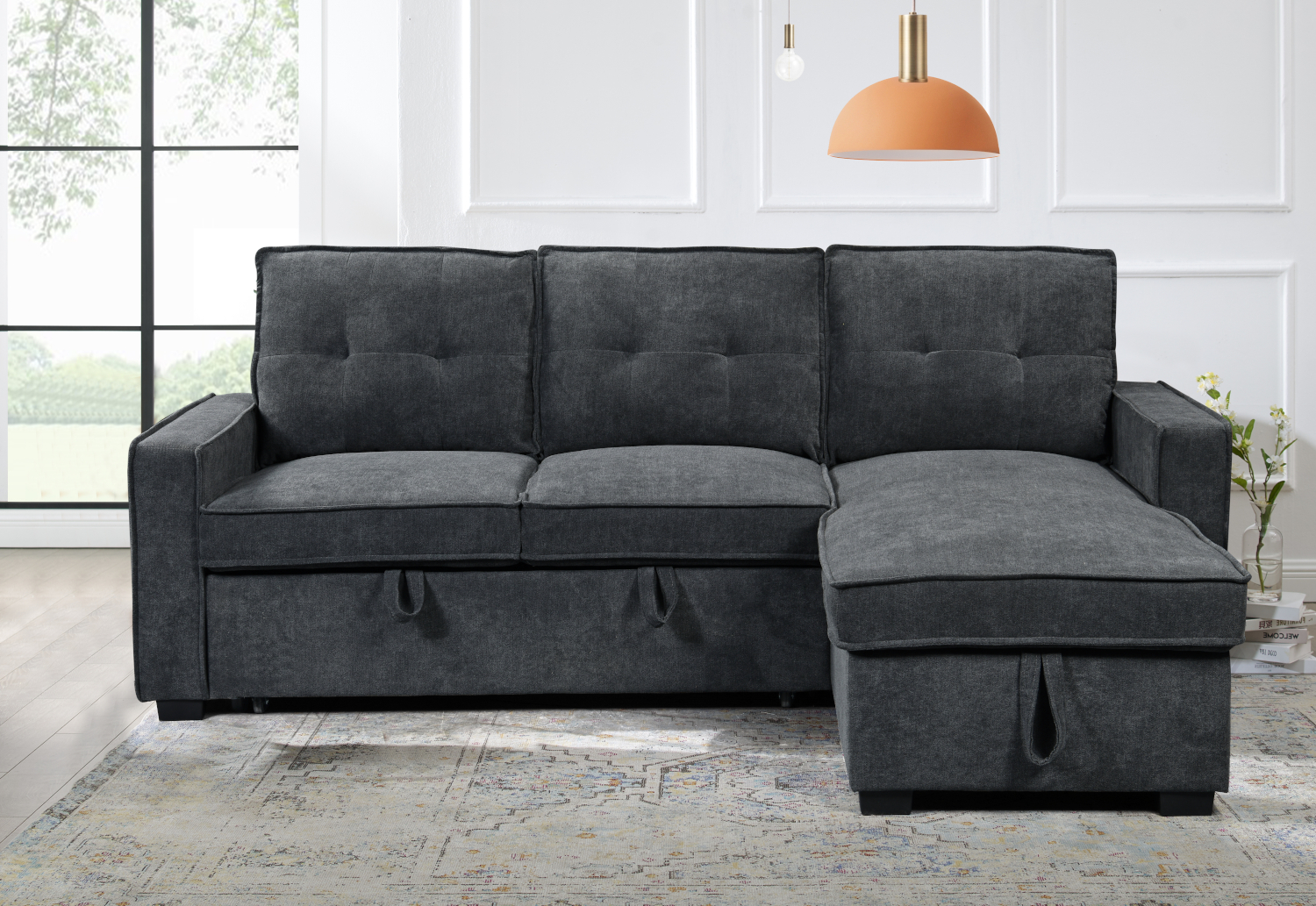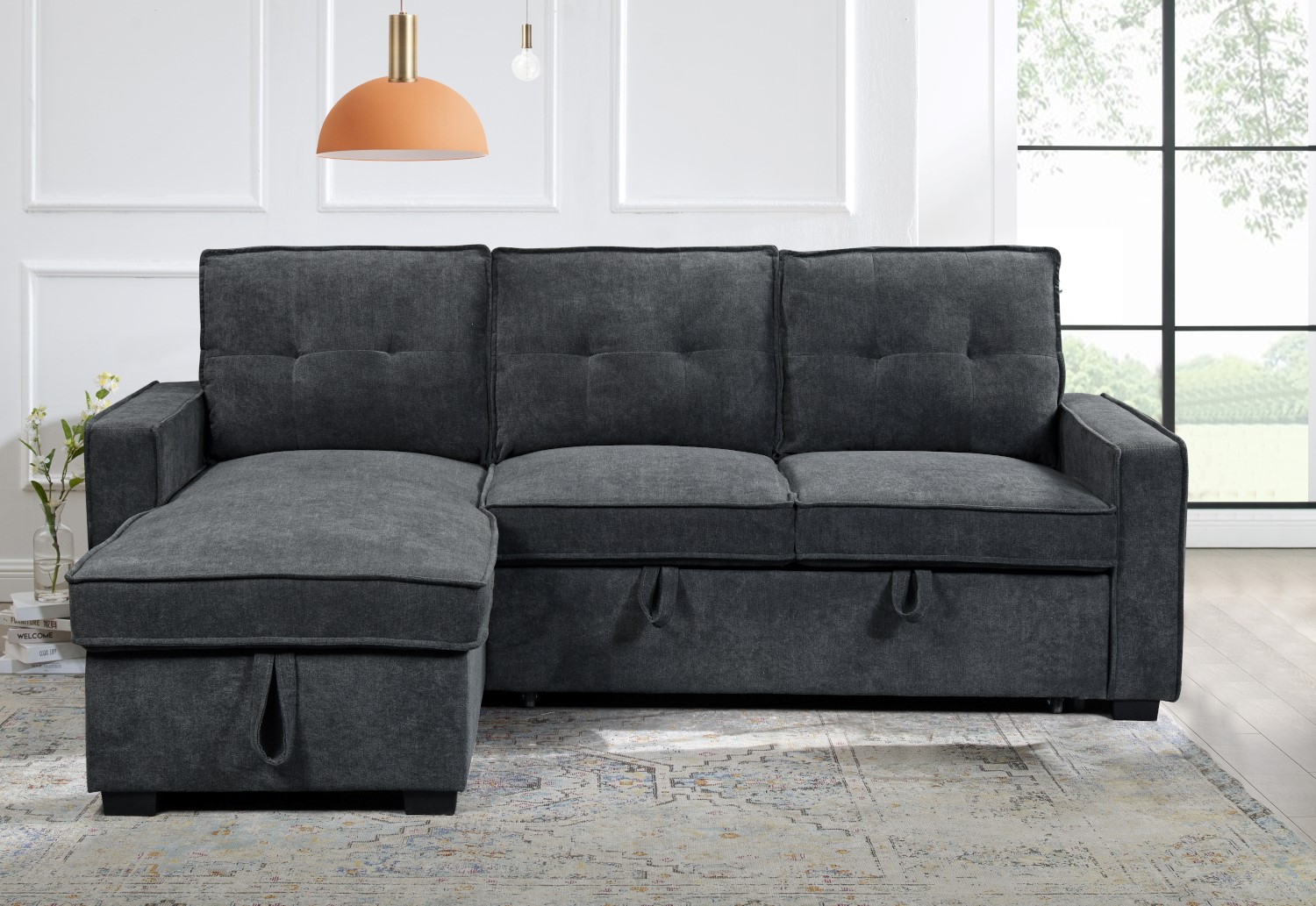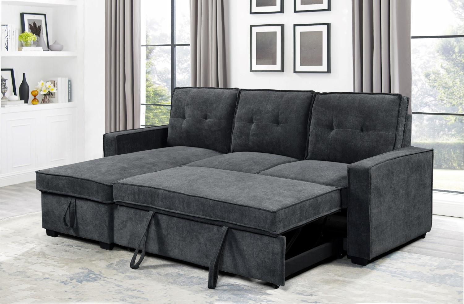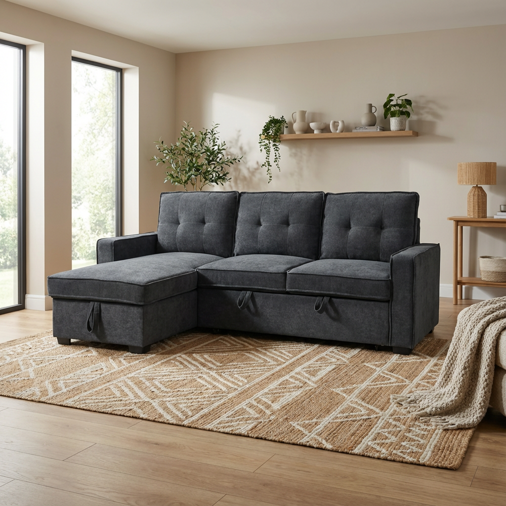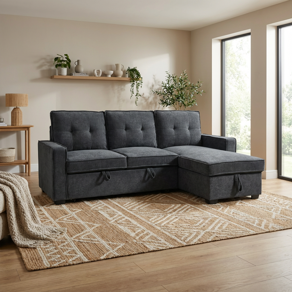 O γωνιακός καναπέ κρεβάτι Tiago θα μεταμορφώσει τον χώρο σας και θα προσφέρει άνεση και πρακτικότητα στην καθημερινότητά σας. Με διαστάσεις 222×150 εκατοστά και ύψος 94 εκατοστά, ο γωνιακός καναπές κρεβάτι Tiago διαθέτει άφθονο χώρο για να φιλοξενήσει τους φίλους και την οικογένειά σας. Το κρεβάτι του, με διαστάσεις 134×192 εκατοστά, προσφέρει άνετο χώρο ύπνου . Η αναστρέψιμη γωνία του τον κάνει ιδανικό για οποιοδήποτε χώρο. Ο γωνιακός καναπές Tiago είναι επενδυμένος με ύφασμα σε χρώμα γκρι σκούρο, προσδίδοντας μια αίσθηση κομψότητας και σύγχρονου σχεδιασμού στον χώρο σας. Διαθέτει επιπλέον αποθηκευτικό χώρο στο ανάκλινδρο, προσφέροντας λύση για την οργάνωση των αντικειμένων σας. Αποθηκεύστε τα κλινοσκεπάσματα, τα μαξιλάρια και τα προσωπικά σας αντικείμενα με ευκολία, διατηρώντας τον χώρο σας καθαρό και οργανωμένο.
