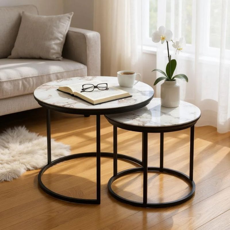 Τραπεζάκια σαλονιού Gary Megapap Mdf – μεταλλικό χρώμα μπεζ εφέ μαρμάρου 65x65x44εκ.