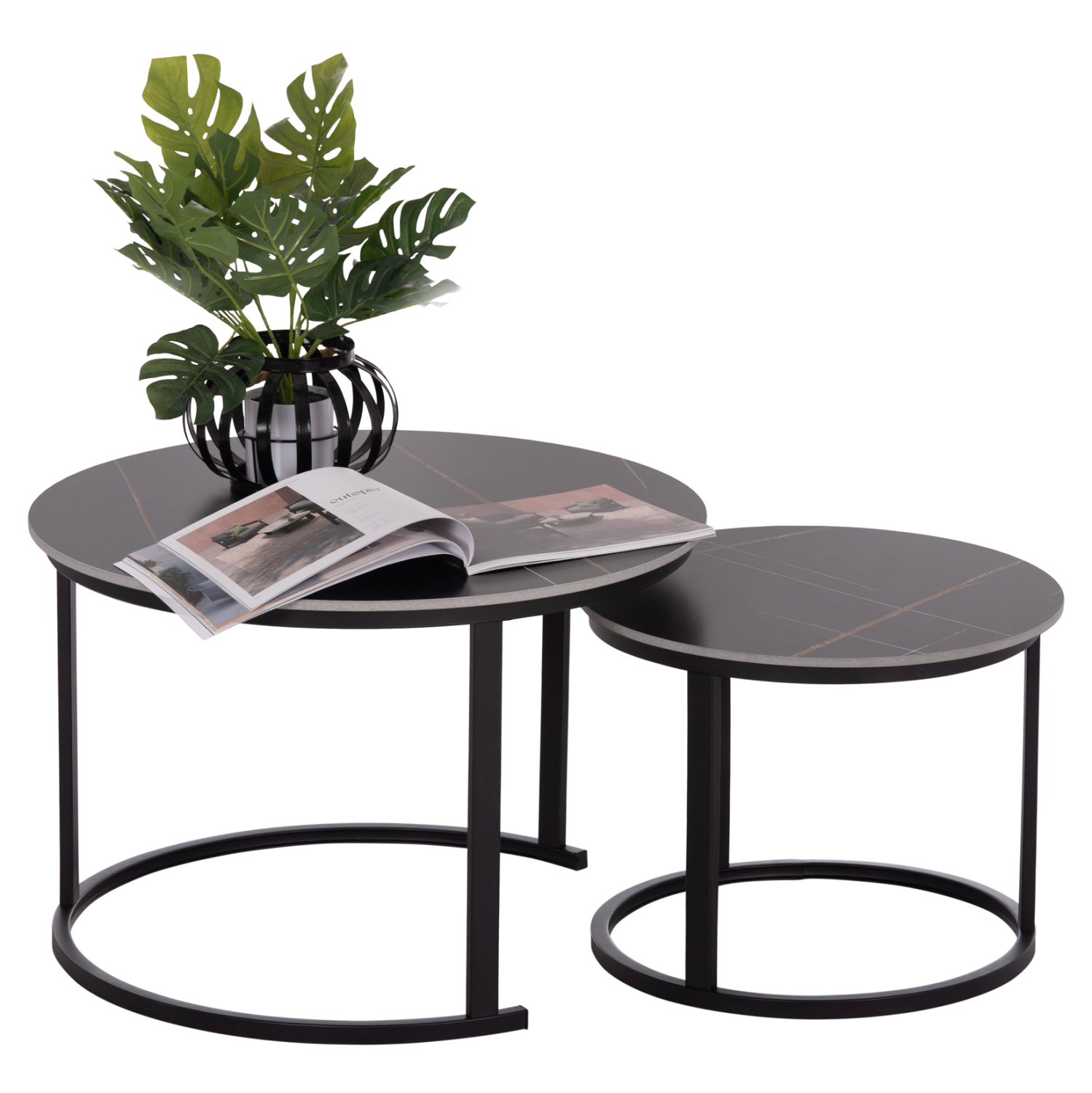 Τα τραπεζάκια TALOS θα σας ενθουσιάσουν με το στυλ και την πρακτικότητά τους. Πρόκειται για 2 τραπεζάκια ένα ψηλότερο κι ένα πιο κοντό με ιδιαίτερο χαρακτηριστικό ότι το ψηλότερο στηρίζεται σε μια ημικυκλική βάση με τρία μεταλλικά πόδια, πράγμα που επιτρέπει στο πιο κοντό να χωράει και να αποθηκεύεται ακριβώς από κάτω. Οι βάσεις και των δύο τραπεζιών είναι μεταλλικές σε μαύρο χρώμα, ενώ οι επιφάνειές τους είναι κεραμικές σε χρώμα ΜΑΥΡΟΥ ΜΑΡΜΑΡΟΥ.