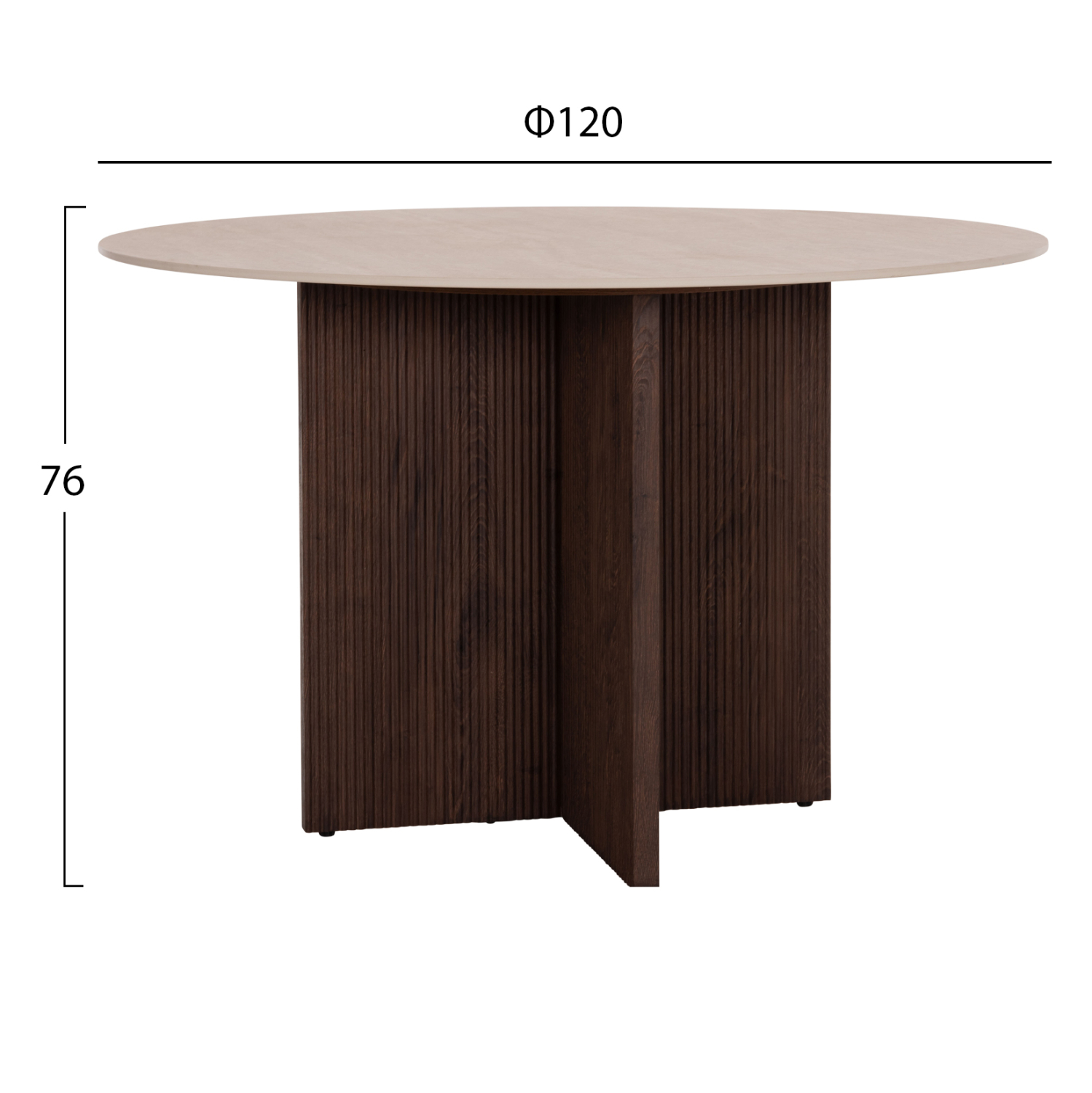 Το τραπέζι τραπεζαρίας SKY είναι στρογγυλό και αποτελεί νέα προσθήκη στην γκάμα μας. Η επίπεδη επιφάνειά του είναι κεραμική σε χρωματισμό TRAVERTINE STONE, ενώ η βάση του είναι σταυρωτή κατασκευασμένη εξολοκλήρου από MDF σε καφέ χρώμα, με όμορφες πτυχώσεις.