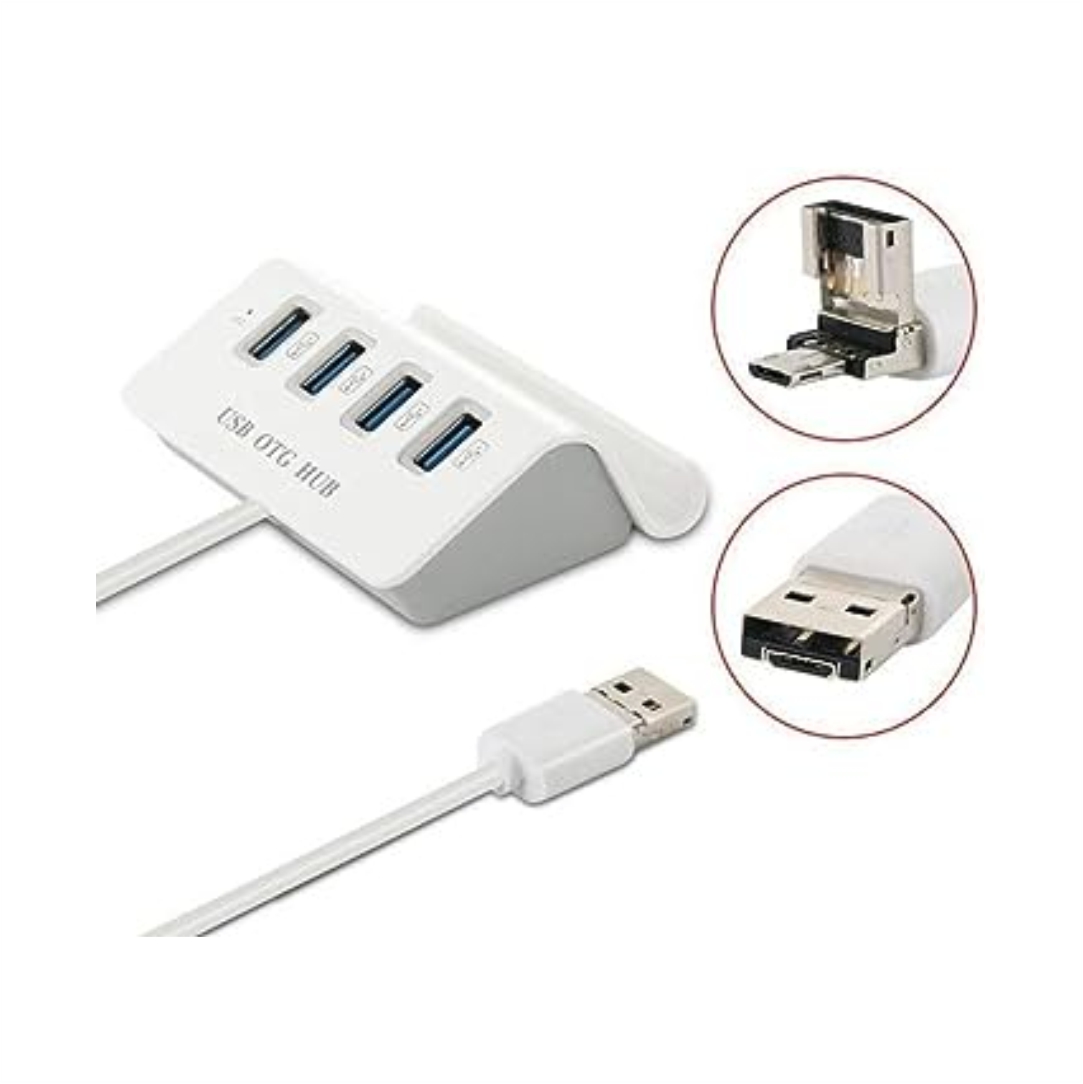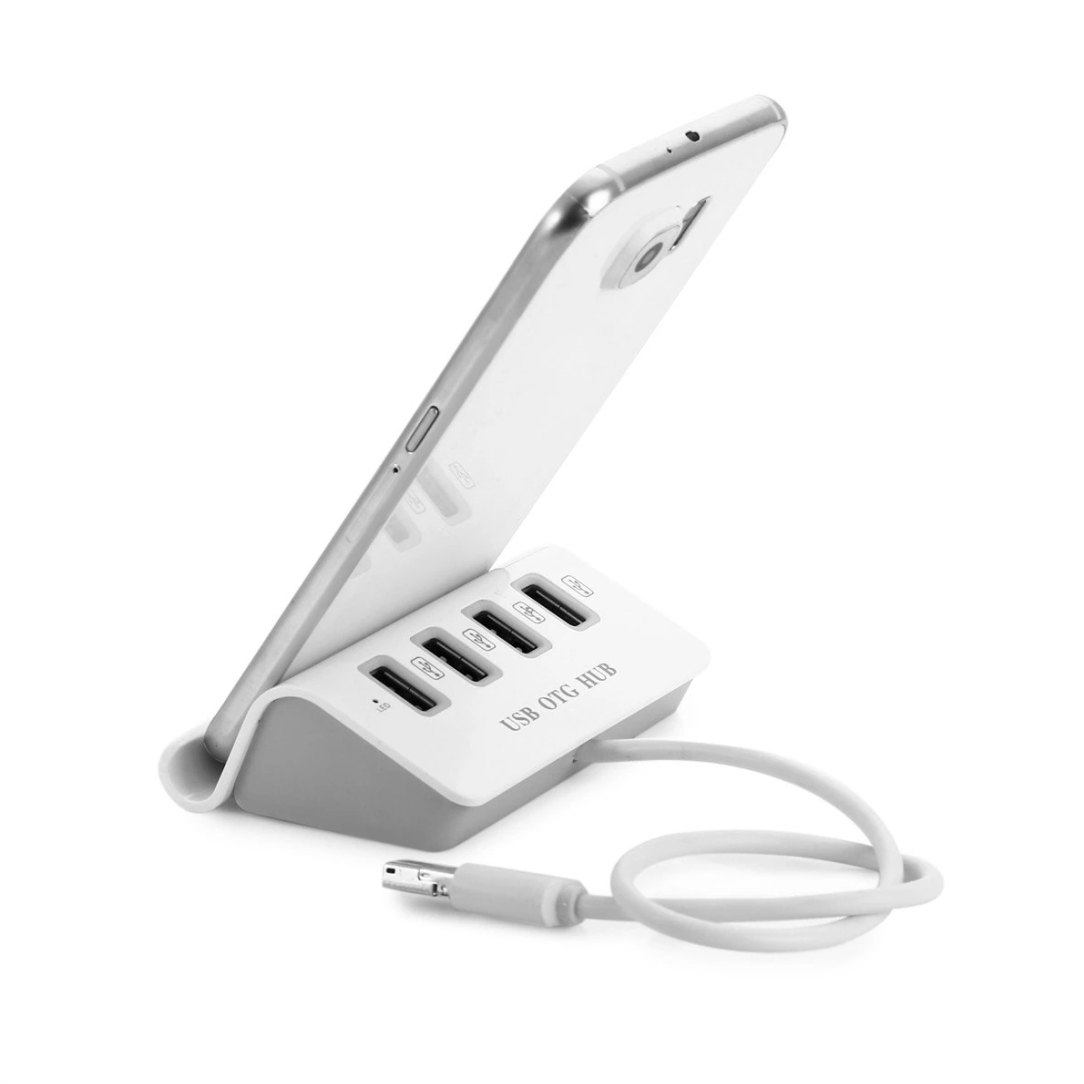 Το USB hub διαθέτει 4  θύρες εξόδου USB 2.0, κατάλληλες για να συνδέσετε ταυτόχρονα στον υπολογιστή, συσκευές όπως ποντίκια, στικάκια, εξωτερικούς σκληρούς δίσκους, πληκτρολόγια και πολλά άλλα. Τροφοδοτείται μέσω του καλωδίου USB που συνδέεται στον υπολογιστή, το κινητό ή το tablet σας. Με σύνδεση USB και micro Usb. Διαθέτει βάση για το κινητό.