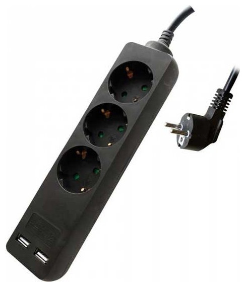 V-TAC Πολύμπριζο Σούκο Μαύρο 3 Θέσεων με 1,5m Καλώδιο 3×1,5mm και 2 Θύρες USB