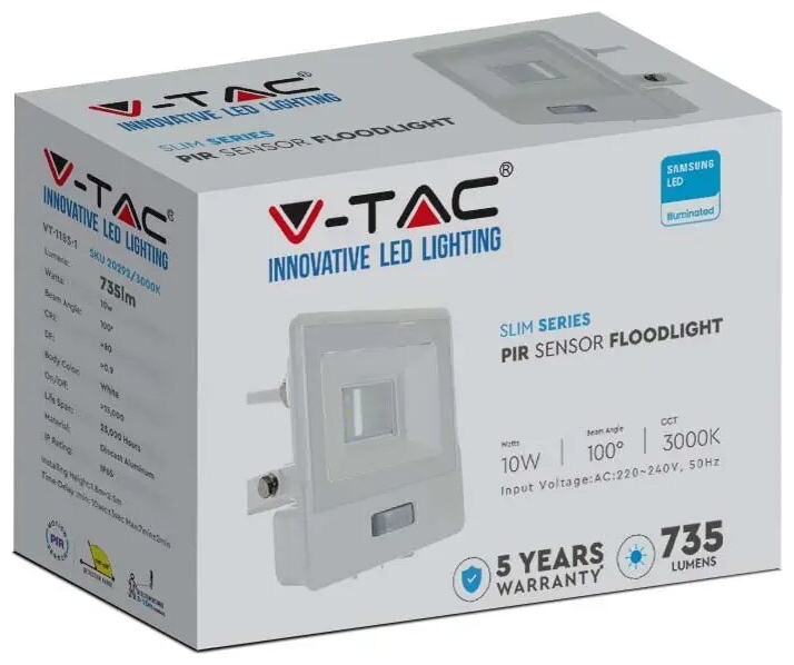 Ακολουθούν περισσότερες πληροφορίες για το προϊόν V-TAC με SKU 20293 , κατηγορία Προβολείς – Με αισθητήρα : power VT-118S-1 LED σποτ με ισχύ 10W Το προϊόν είναι κατασκευασμένο από μαύρο χυτό αλουμίνιο Με τεχνολογία SMD LED , διαθέτει φωτεινό δέσμη 100° και φωτεινή ροή 735 lm Έχει αναλογία 73 * lm/W Το προϊόν έχει βαθμολογία προστασίας IP65 που το καθιστά ιδανικό για εξωτερική χρήση ακόμα και κάτω από παρατεταμένη βροχή