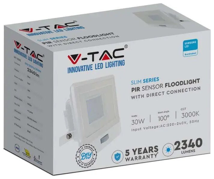 V-TAC Προβολέας LED Samsung chip 30W Ψυχρό λευκό 65000K Λευκό σώμα με ανιχνευτή και απευθείας σύνδεση 20276 V-TAC Προβολέας LED Samsung ch...