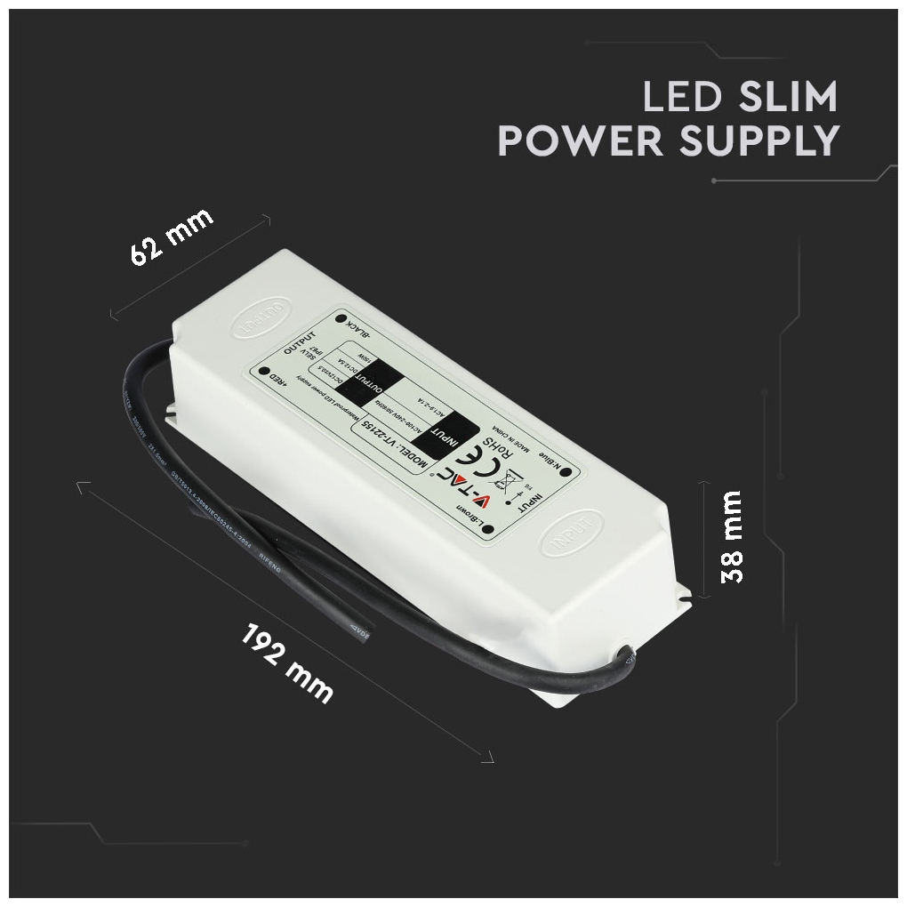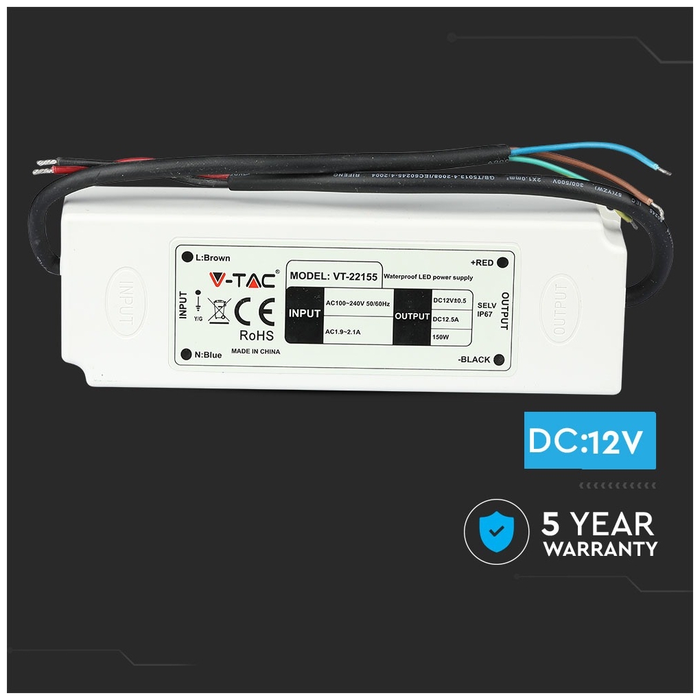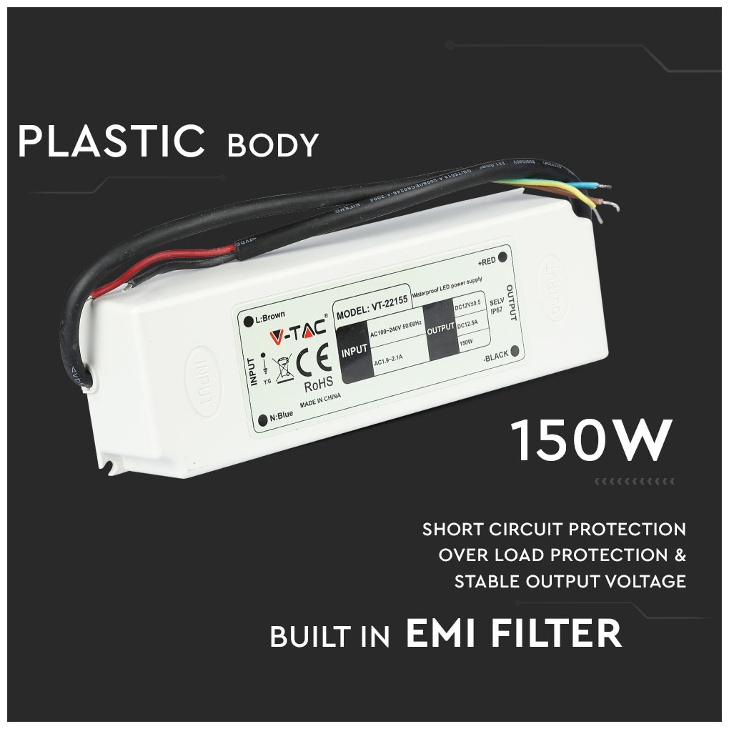 Ακολουθούν περισσότερες πληροφορίες για το προϊόν V-TAC με SKU 3250 , κατηγορία Τροφοδοτικά – 12V : PRO power αδιάβροχο τροφοδοτικό με βαθμό προστασίας IP67 για εσωτερική ή εξωτερική χρήση VT-22155 με πλαστικό σώμα, ισχύς 150W Είσοδος 100-240V AC 1 9 ~ 2 1 A 50/60Hz 5A Τροφοδοτικό με προστασία από υπερφόρτωση και βραχυκυκλώματα Στα πλαϊνά του τροφοδοτικού υπάρχουν οπές για στερέωση Μέσω της εξόδου με καλώδια συγκόλλησης μπορεί εύκολα να συνδεθεί σε λωρίδες LED ή να χρησιμοποιηθεί για την τροφοδοσία άλλων ηλεκτρονικών συσκευές όπως δρομολογητές, διανομείς, κάμερες ασφαλείας, συστήματα ήχου-βίντεο κ.λπ