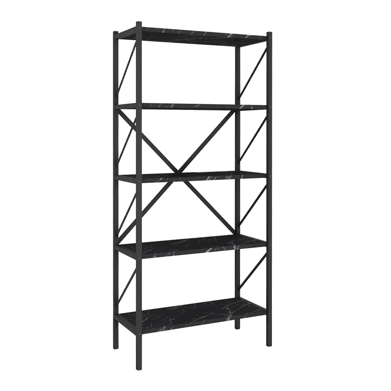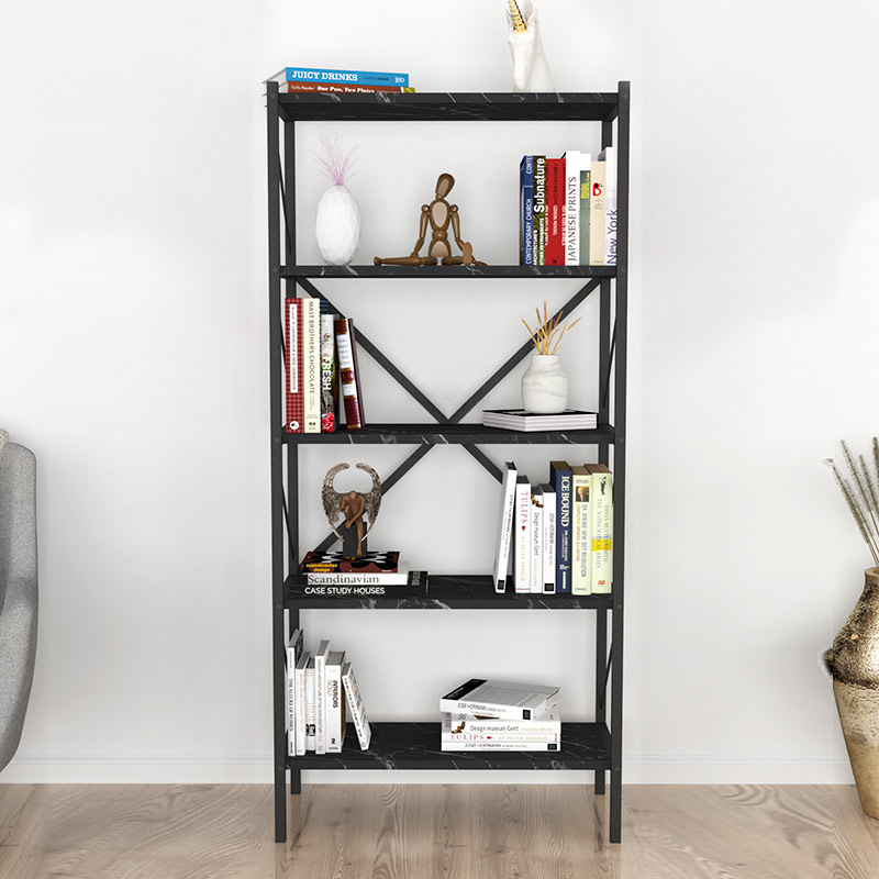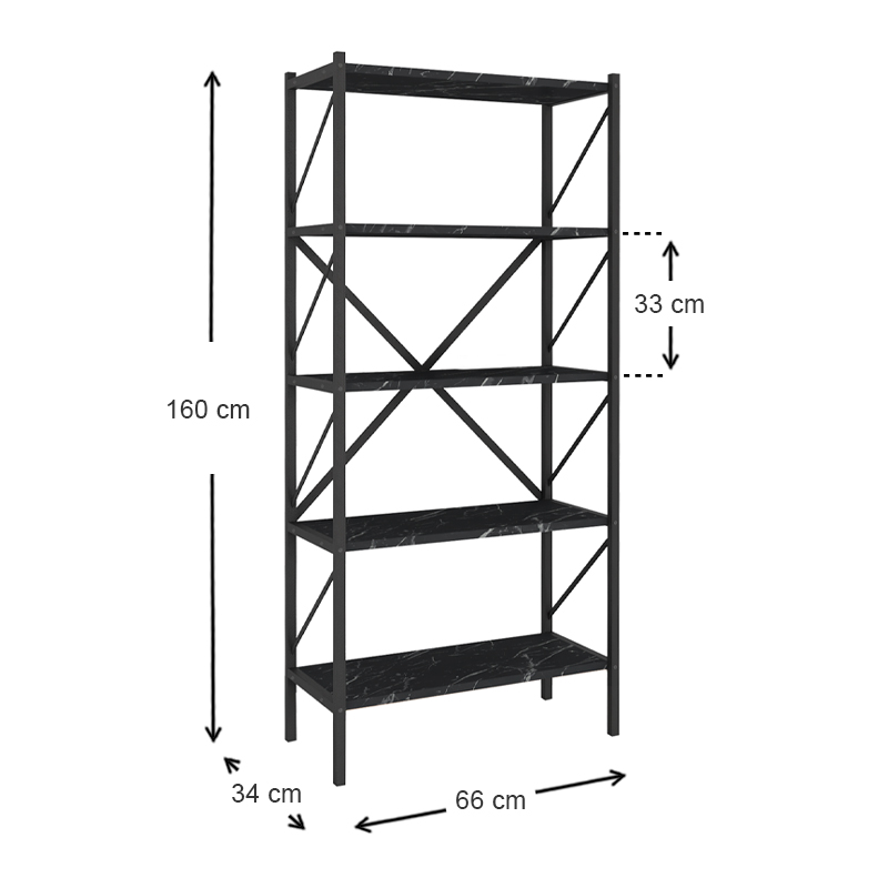 Βιβλιοθήκη Jocasta Megapap μεταλλική – μελαμίνης χρώμα μαύρο εφέ μαρμάρου 66x34x160εκ.